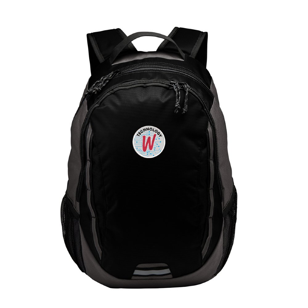 Key features include a roomy main compartment with a suspended, padded laptop sleeve (fits most 15" laptops), a three-tier office compartment with a carabiner, and comfortable air mesh padded back panels and shoulder straps with a sternum chest strap. The large front pocket prominently features a woven Wendy's Technology logo, making this a practical and professional bag for carrying all your essentials.