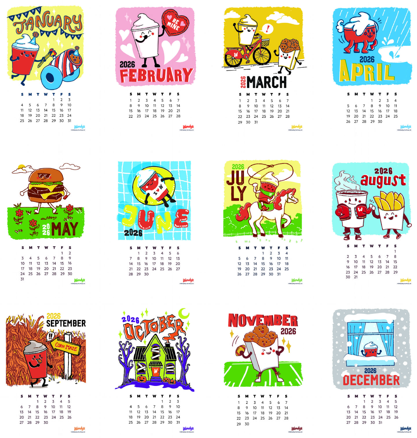 This isn't just a calendar—it's a year-long dose of fun, featuring a unique, custom illustration for every month starring your favorite Wendy's-inspired friends! Watch Nurdle and friends celebrate the seasons and holidays in style, bringing a smile to your desk every single day.